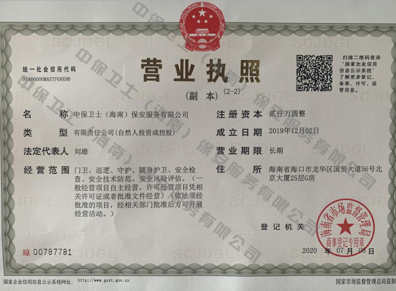 郑州刘强知识产权咨询有限公司是经海南省公安厅批准,依法持有《保安服务许可证》,提供保安服务、门卫、巡逻、守护、区域秩序维护、随身护卫、安全检查的专业化保安服务公司。